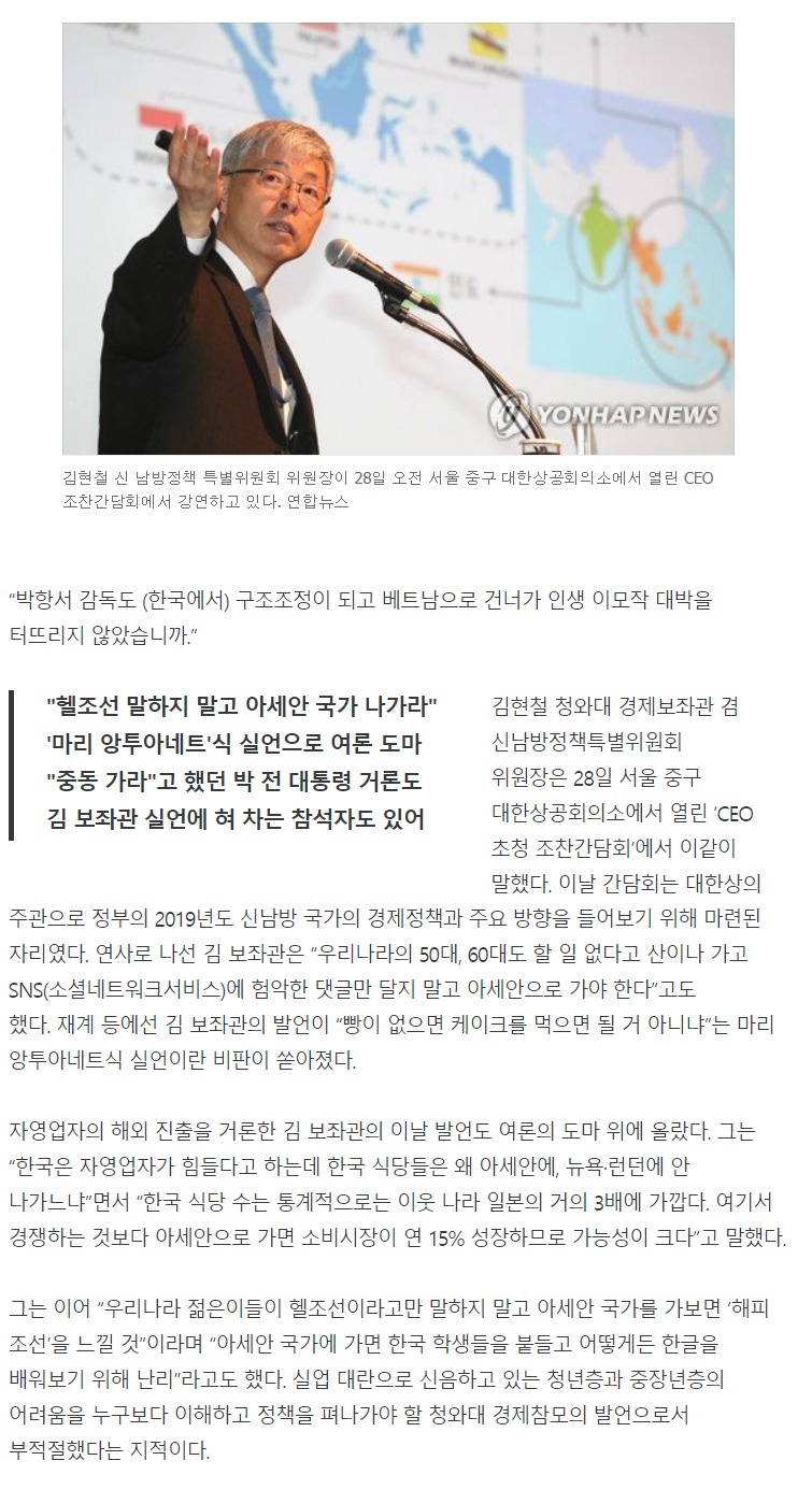 50,60대 악플달지말고 아세안 가라 박항서가 대박을 터트렸듯 자영업자 힘들다는건 우리나라 식당이 타국에 3배라 경쟁이 심해서 젊은이들은 헬조선 타령하지마라 아세안 국가애들이 얼마나 우리 부러워하는데 가 요약이지 기사 제목 스레기같이 뽑은거 물론 그렇다고 워딩이나 내용이 적절하다고는 생각 안함