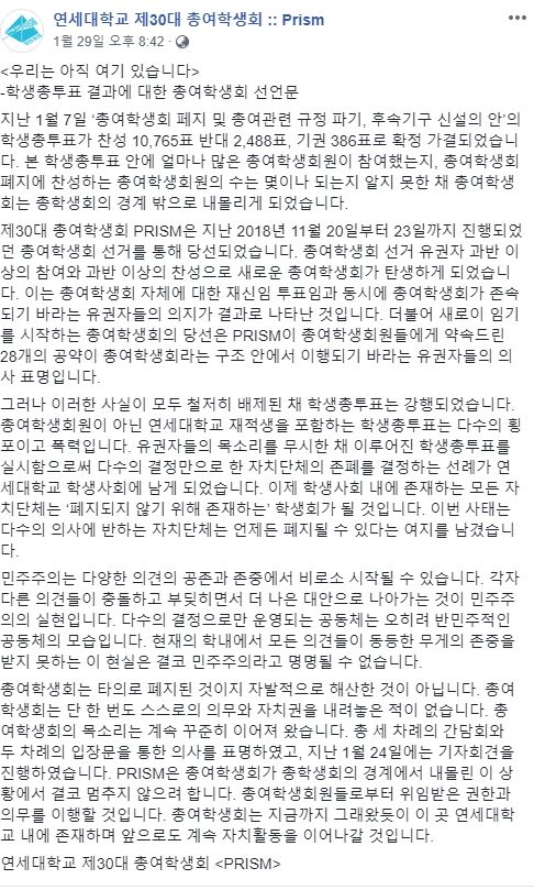 1. 다수의 결정으로만 운영되는 공동체는 반민주주의적임.2. 자발적 해산이 아니라 타의로 폐지된 것. 3. 그러니까 우리는 자치 활동을 이어나갈 것.