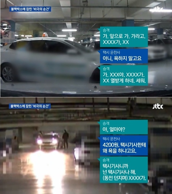 블랙박스 영상에는 승객 A 씨가 자신이 사는 아파트 지하 주차장에 도착하자 택시 기사 B 씨에게 “가. 앞으로 가라고. XXX가 열받게 하네. 세워”라며 다짜고짜 욕설을 퍼붓는 모습이 나온다. A 씨가 계속해서 심한 욕설을 내뱉자 참다못한 B 씨는 “아니 욕하지 말고요”라고 받아친다.