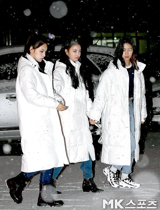 오늘 아침 뮤뱅 출근길. 눈 와서 미끄럽다고 울상된 리아랑 손 잡아주는 예지, 류진.