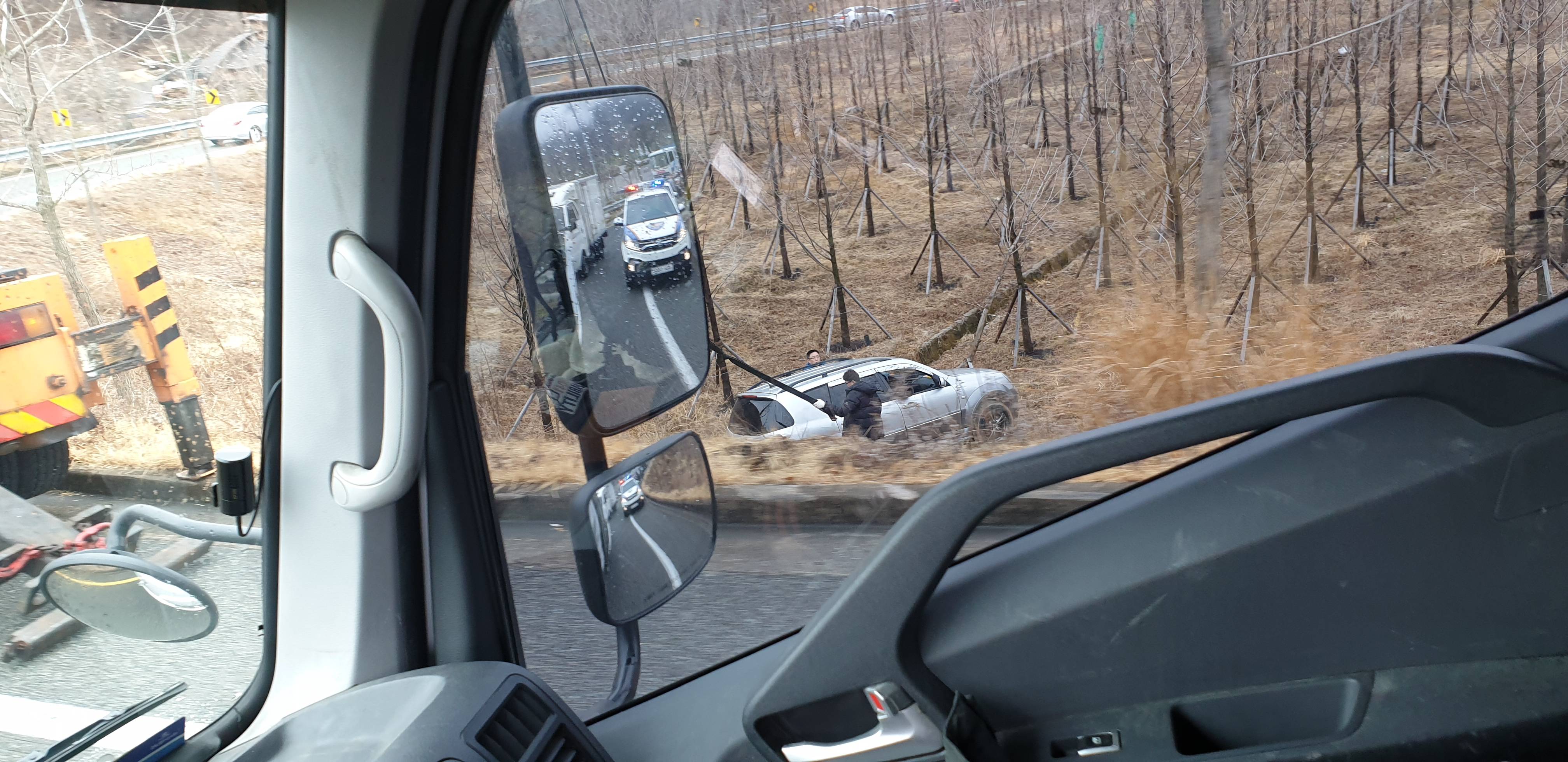 40톤짜리 트럭이랑 박았지만 빗길이라 다행히 언덕아래로 밀림
