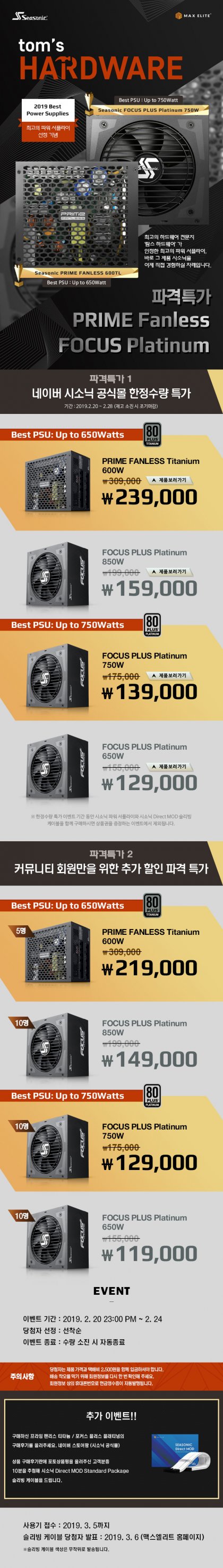 Seasonic PRIME Taitanium Fanless 600W : https://smartstore.naver.com/maxelite/products/2662876700 Seasonic FOCUS Plus Platinum 850W : https://smartstore.naver.com/maxelite/products/3270906143 Seasonic FOCUS Plus Platinum 750W : https://smartstore.naver.com/maxelite/products/3270719634 Seasonic FOCUS Plus Platinum 650W : https://smartstore.naver.com/maxelite/products/3271354551