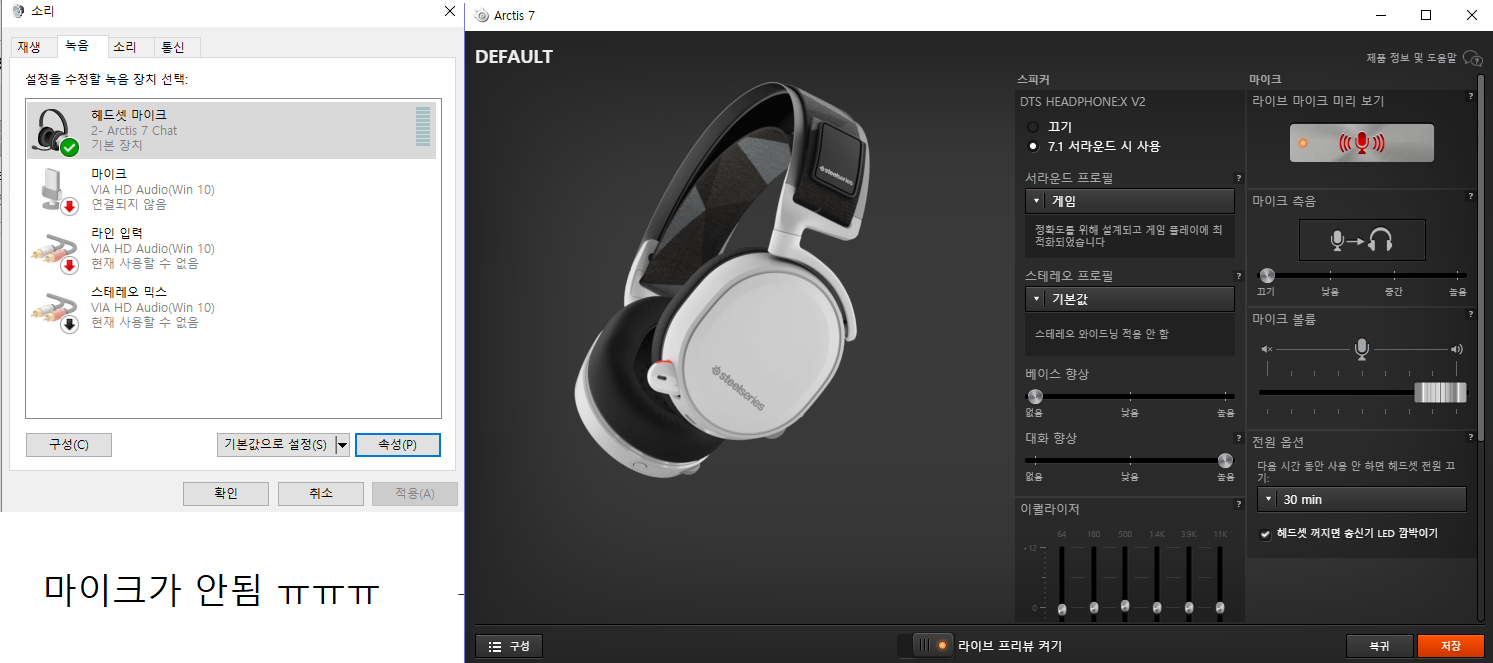 근데 마이크 망가진건 아닌게 마이크 측음 기능 키면 마이크 소리가 다 스피커로 인식됨.