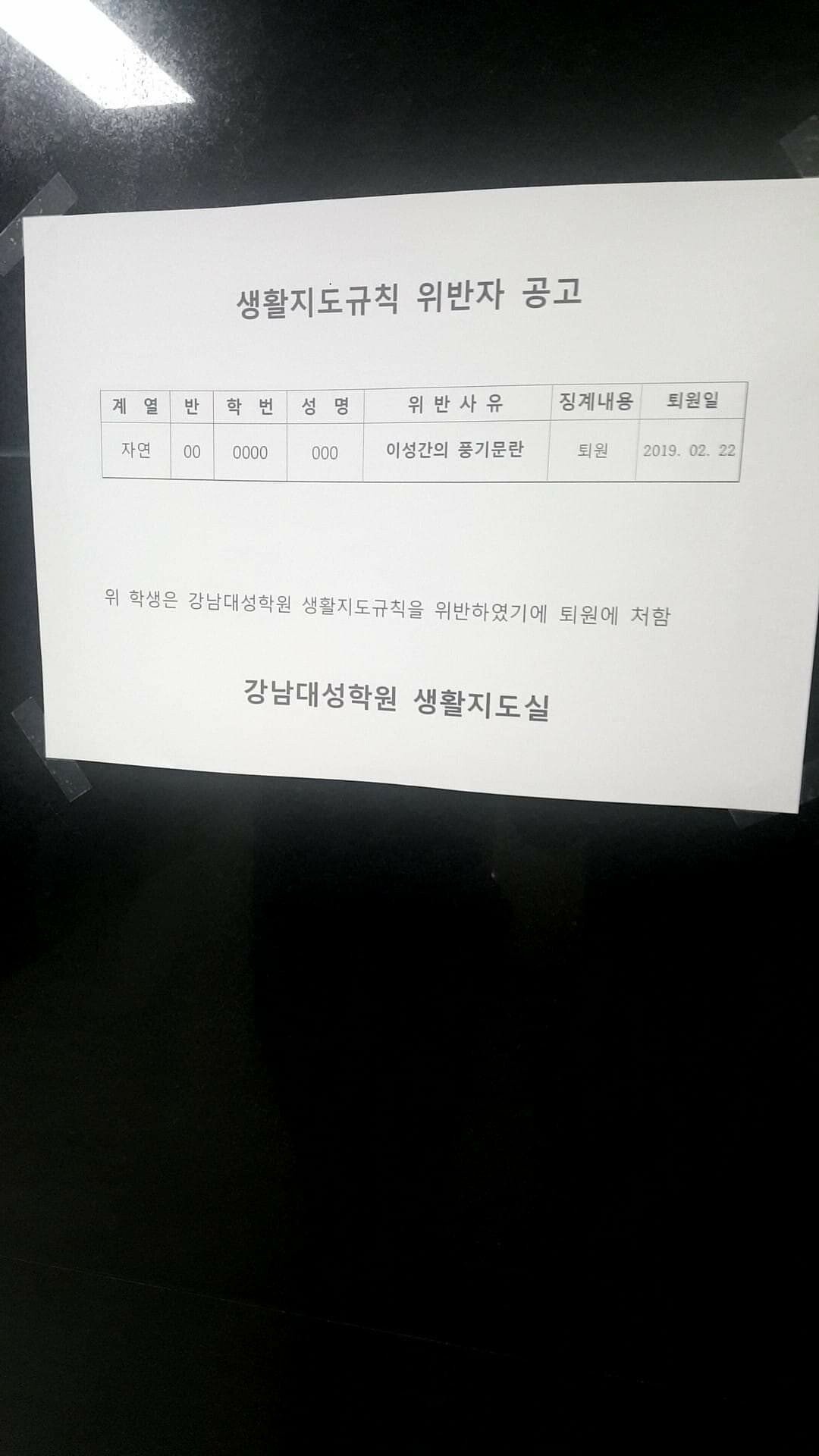 어차피 해당자는 학원 측에서 직접 얘기해서 내보냈을 거고 저 공고문은 다른 사람들에게 경고하는 의미일 뿐이니까 굳이 상세한 정보가 필요할 이유가 없지