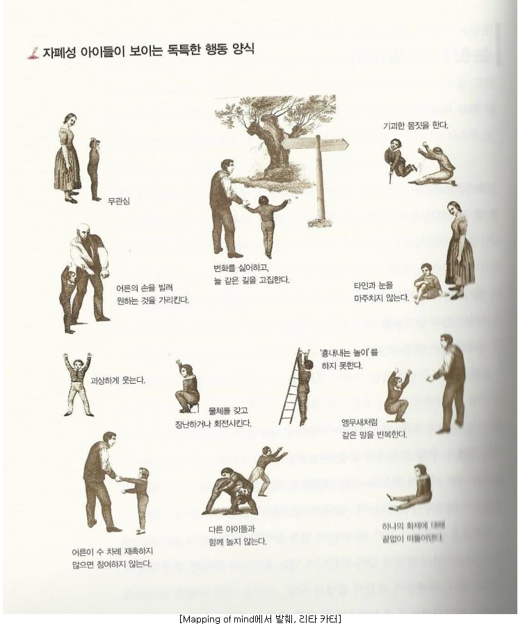어른의 손을 빌려 원하는 것을 가리킨다 변화를 싫어하고 늘 같은 길을 고집한다 어른이 수차례 재촉하지 않으면 참여하지 않는다 다른 아이들과 함께 놀지 않는다 이거 우리 아들이 해당되는 사항이고 실제로 말이 느림. 말이 느린거 때문에 이번주에 세브란스에서 발달검사 받았는데 자폐얘긴 없었지만 겹치는게 있긴 하군...