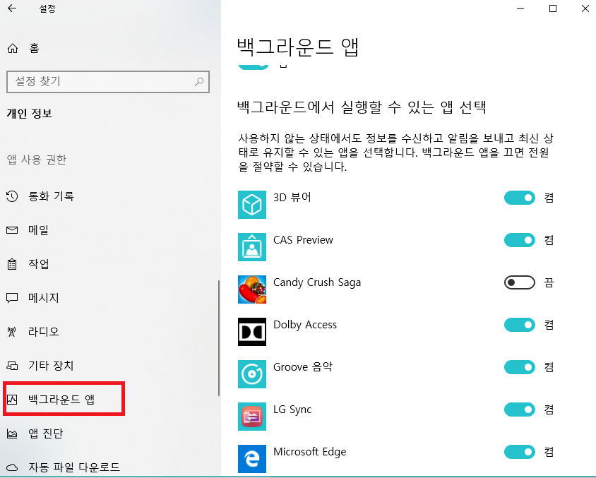 시작 돋보기에 백그라운드 검색 후 쓸모없는것 끌것