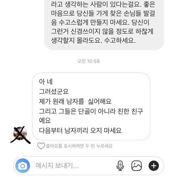 3. 이유를 물어보니 '내가 남자가 싫어서 그랬다 남자끼리 오지 마라'