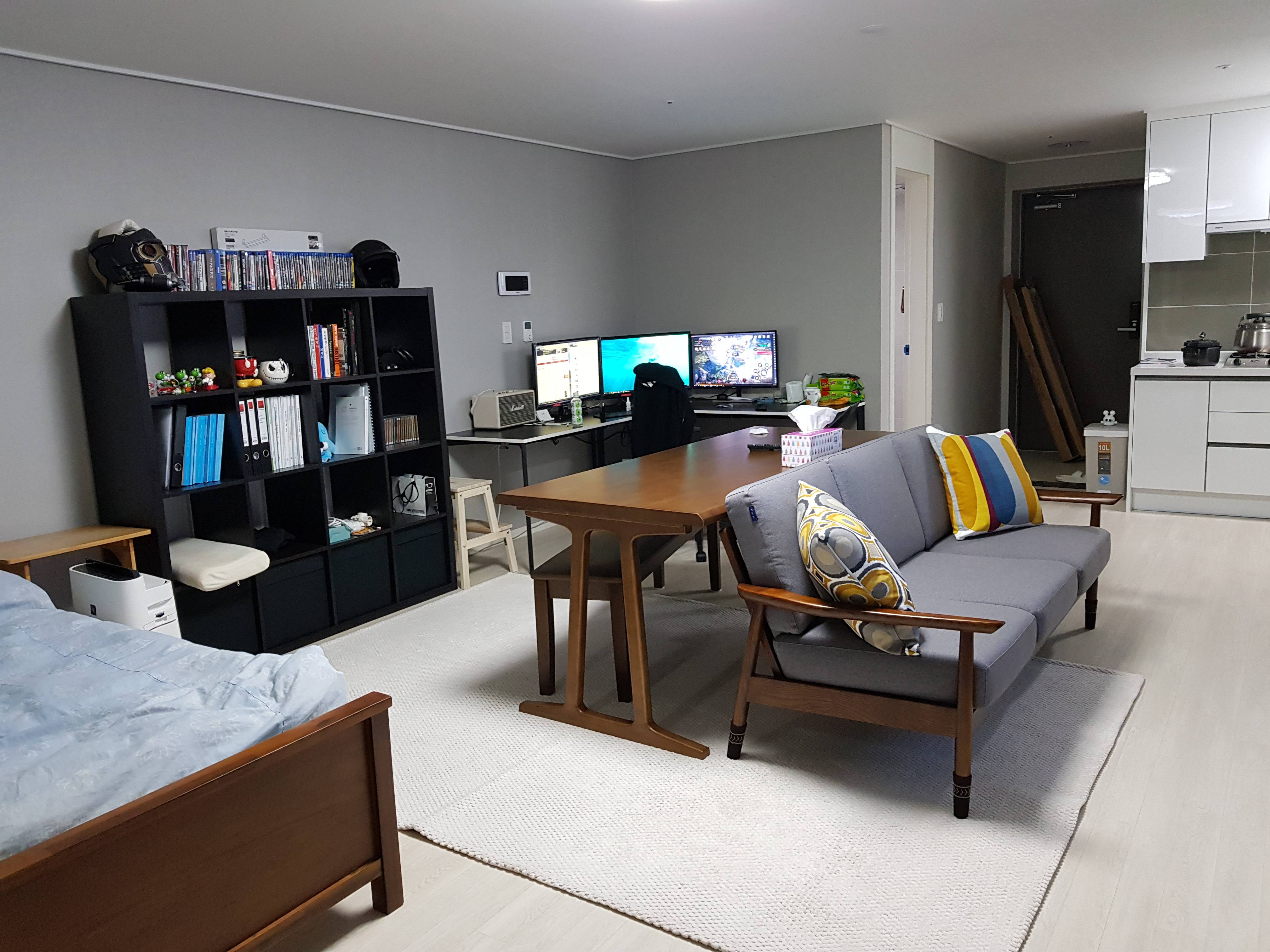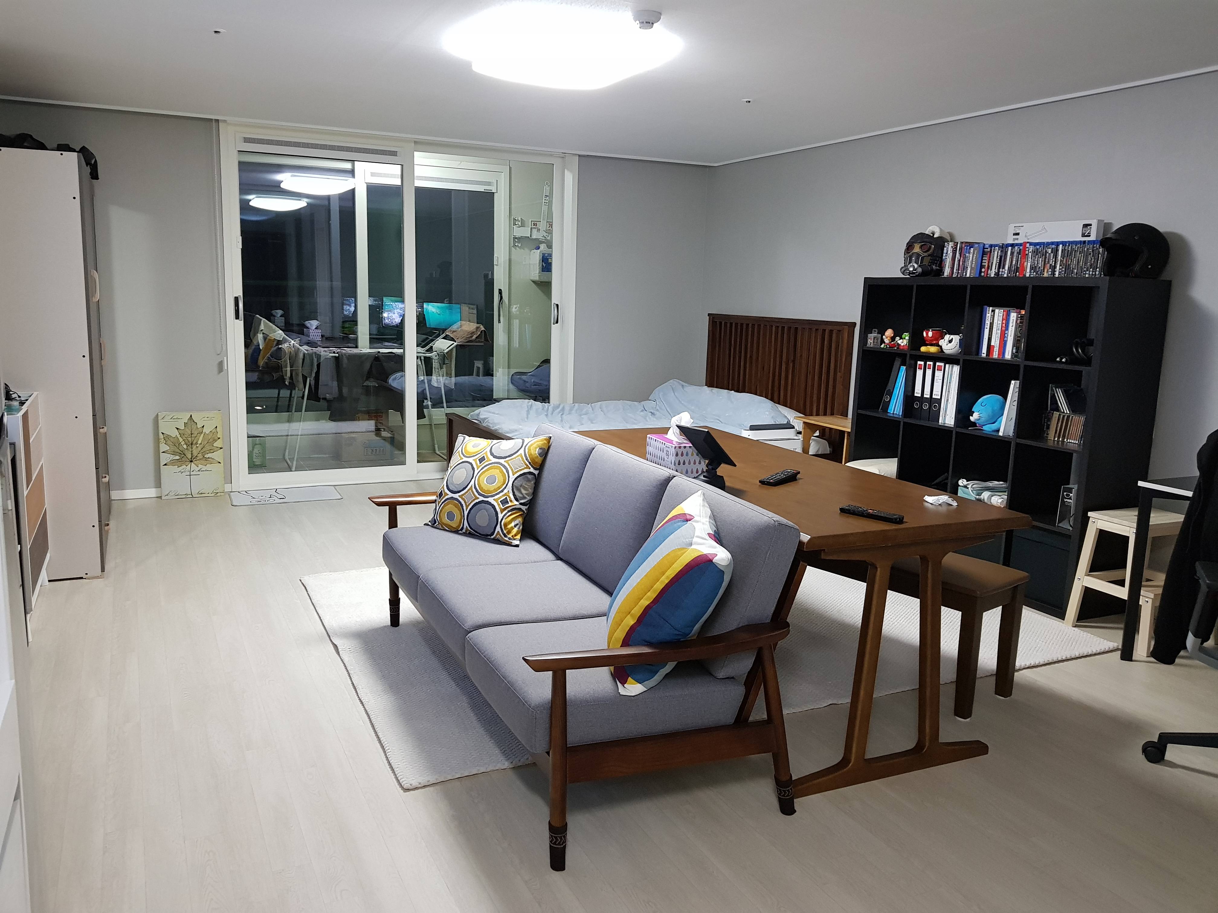 원룸인가? 침대 위치가 특이하군