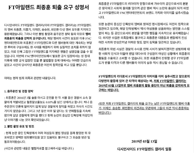 FT아일랜드 일부 팬들은 13일 인터넷 커뮤니티 디시인사이드 FT아일랜드 갤러리에 최종훈의 팀 퇴출을 요구하는 성명서를 올렸다.