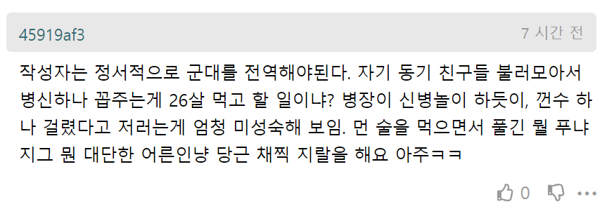솔직히 필요이상 논란이 되기는 했지만.. 그걸 떠나서 13학번이라는 저 전역한 부사관출신애가 딱히 이상하다고 생각은 안드는데? 대학 똥군기는 벌써 몇년전부터 온오프상에서 문제가 되었던 것이고, 어찌보면 사회에서 가장 평등한 위치(대학생들 선후배)에 있어야할 것들이 부리는 ㅈ같은 똥군기 문화가 사회에서 계급구조가 가장 뚜렷한 군대에서 뺑이치던애 눈에 얼마나 같잖게 보였겠냐?