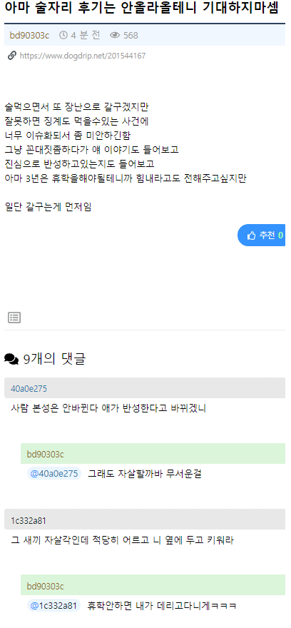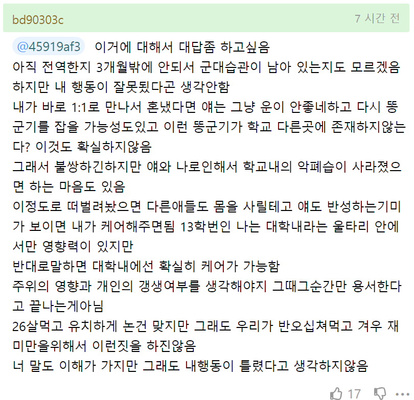 까놓고 전역한지 얼마 안된 입장에서 더 같잖게 보였을테고 맘독하게 먹었으면 대학내 똥군기로 저놈 하나는 학교 자퇴시킬수있는 수준이었는데ㅋㅋ