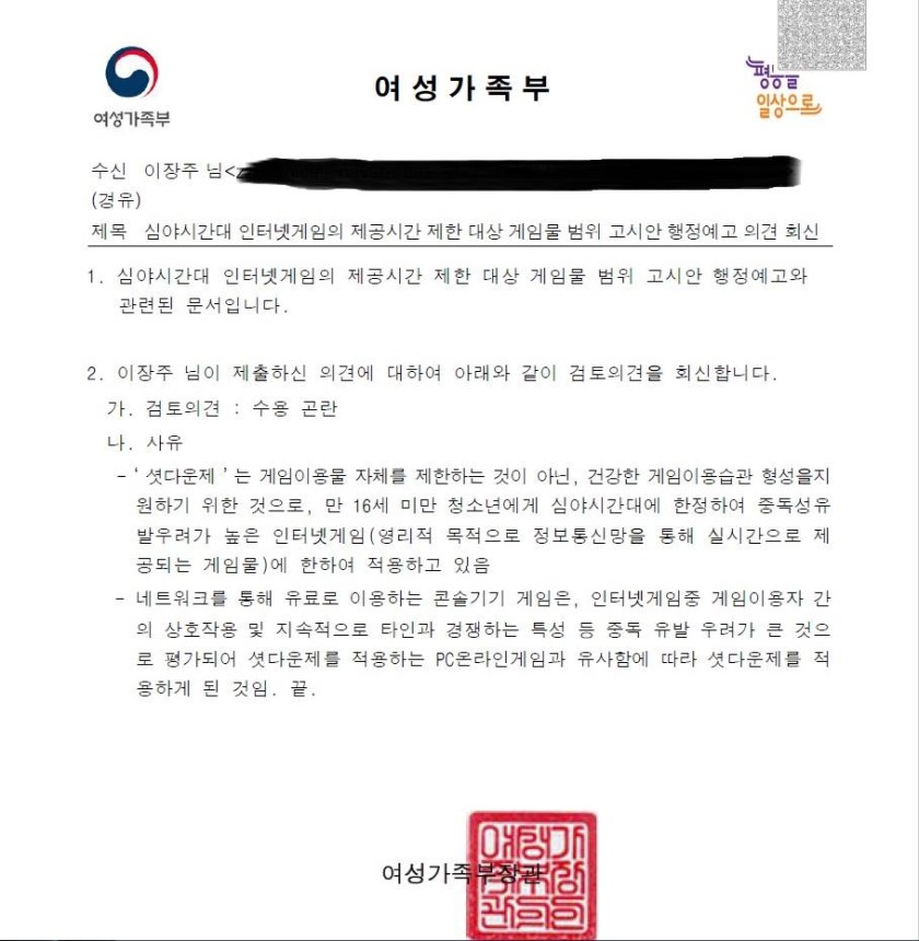 1. 셧다운제 목적이 심야시간 청소년의 '게임이용제한'이 아니라 '건강한 게임이용습관 형성을 지원'하는 것이 목적이랍니다. 정말 놀랍습니다. 레트로복고 트랜드에 맞춰 '두발', '화장', '스커트'도 엄격한 기준을 확립하여 맑고 밝고 활기찬 청소년문화계도를...여기에 새벽종까지 울리면 금상첨화일 듯하군요. 근데 왜 이런 사업을 여가부가 하죠? '문화체육관광부'는 '빙다리 핫바지?'