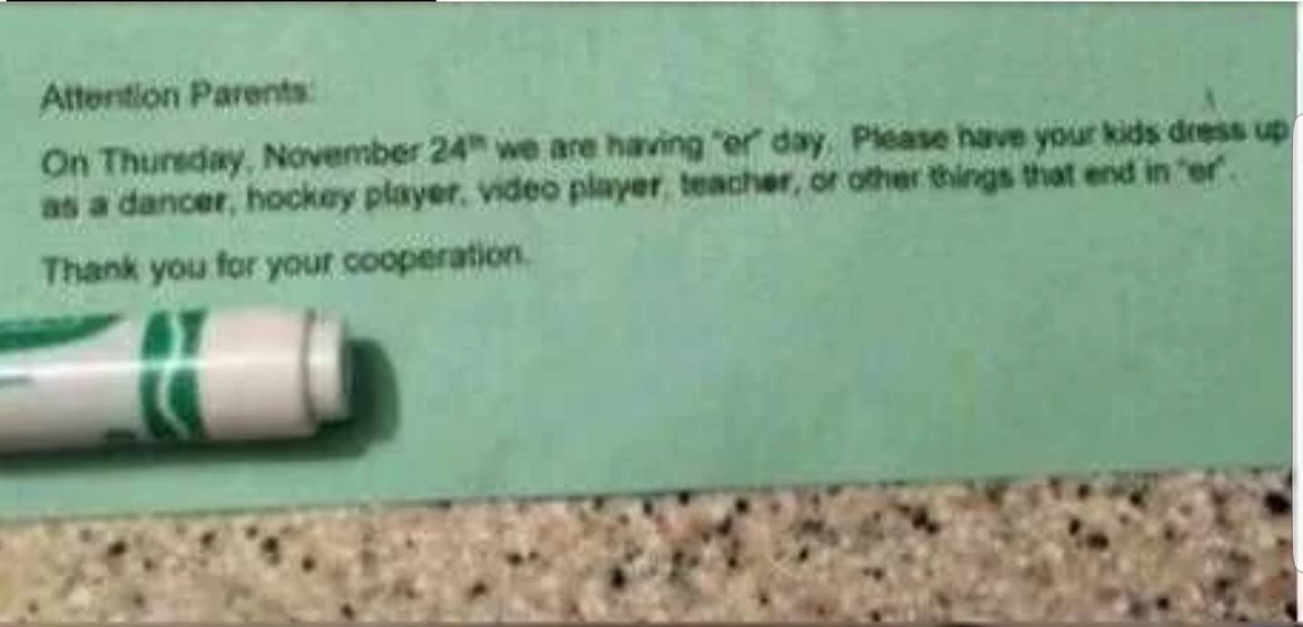 학부모님들께 알려드립니다. 11월 24일 목요일, 학교에서 "er"데이가 열립니다. 부디 학생들을 dancer, hocky player, video player, teacher 또는 다른 "er"로 끝나는 것 차림으로 보내주세요. 협조에 감사드립니다.