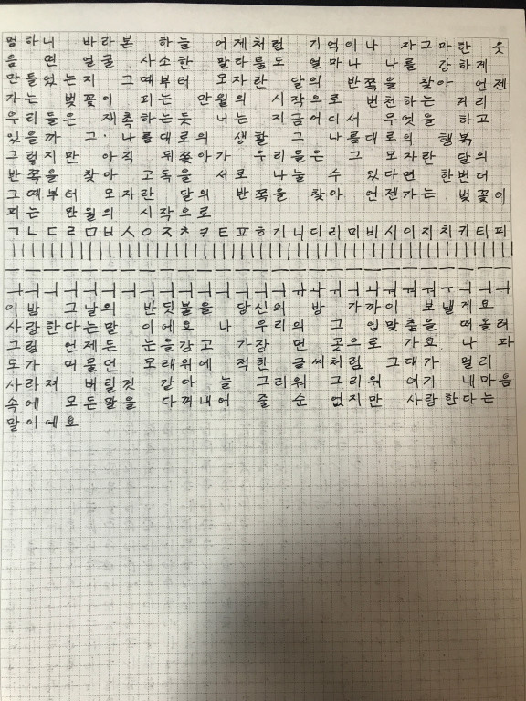글씨도 매일 공부하기 전에 20분~30분 정도 씩 줄긋고 자음모음 쓰고 노랫말 한곡이나 두곡정도 적어보는데