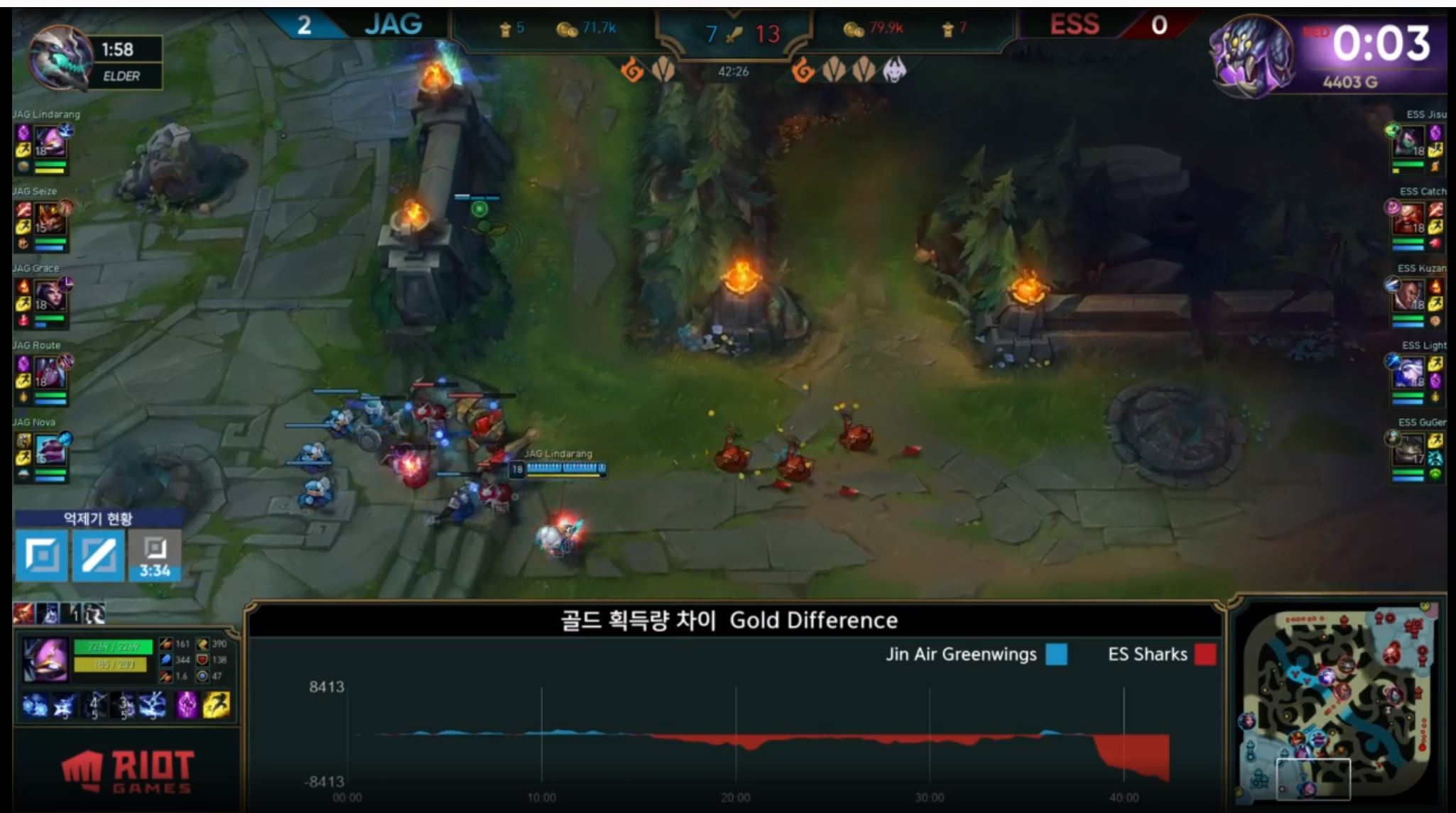 근데 여기도 마찬가지임 그리핀이랑 똑같음 JDG가 3라인다지는라인캐릭고르고 거기에 6렙이후에 활동하는 녹턴까지 이길래야 이길수가 없지