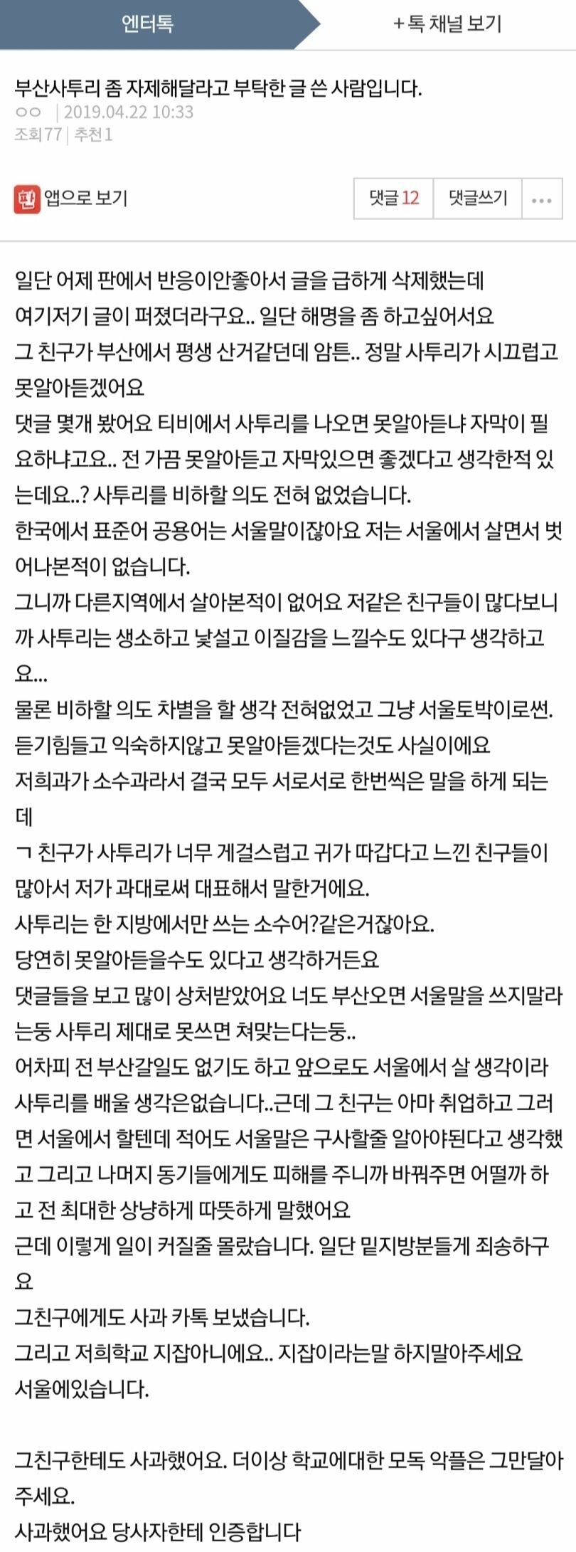 ㅈ빠는소리하네 내가 경기서울만30년넘게 살았는데 부산사투리때문에 알아듣기힘든건 100에 한둘인데