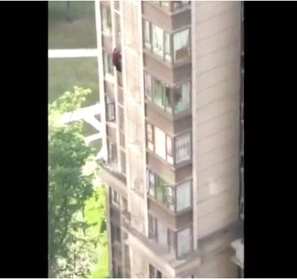 할머니는 문을 열 수 없자 목욕탕 창문을 통해 밖으로 탈출하는데 성공한 뒤 아파트 벽을 타고 아래로 내려오고 있었다.