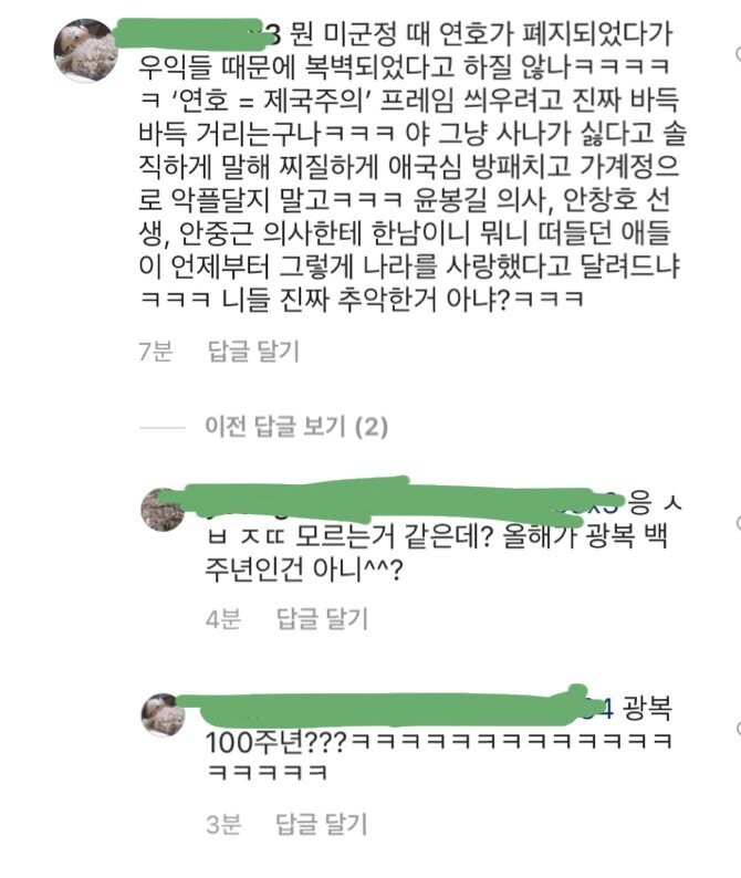 쟤네 아마 유관순 어쩌구 하면서 100주년 이런거 티비에서 해줬었는데 그거 보고 광복 100주년이라고 생각하는거일듯ㅋㅋ