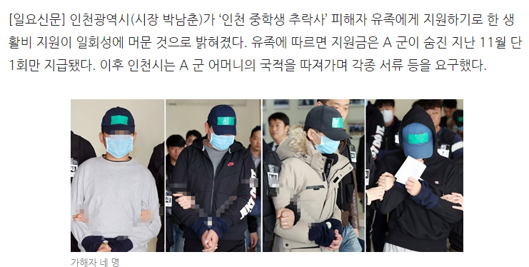 인천시 연수구청 관계자는 “2018년 11월 A 군 유가족이 생활비지원대상자로 선정돼 생활비를 지급한 것이 맞다”면서도 “사건이 발생하고 시민 단체 등으로부터 일시적 후원금 1000만 원 정도 받으셨다. 경제적 어려움이 없다고 해 SOS긴급 지원을 종료시켰다”고 밝혔다.
