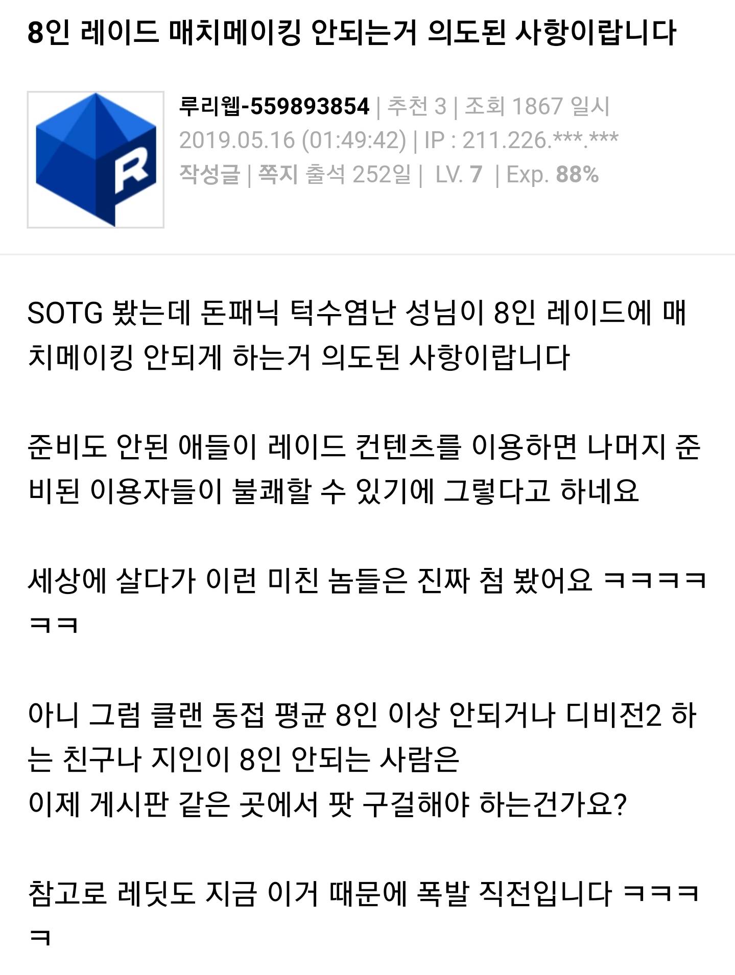 요즘 세상이 어떤 세상인데 8인 레이드를 매치메이킹없이 내놓냐
