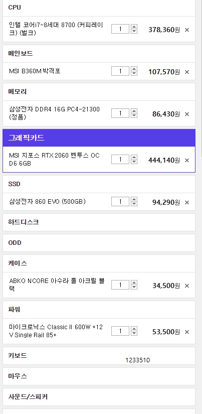 위 사진엔 안나왔는데 사제쿨러는 3만원정도짜리 잘만 쿨러 추가해져 있음.