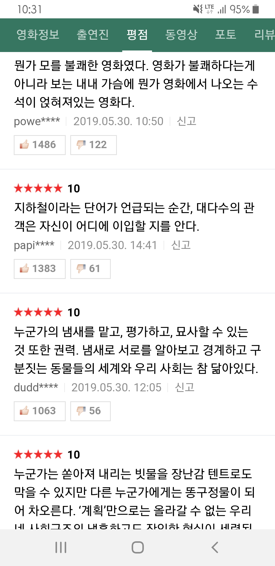 근데 기생충 평점충들 왤케 다 평론가빙의해서 지럴들이냐 걍 재밌어요 별로에요나쓸것이지