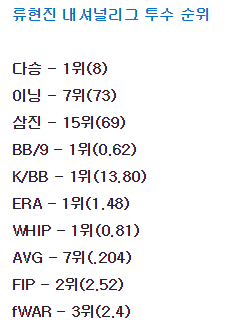내쇼날 현재 승수1위 방어율1위 이닝당출루1위 맞음?