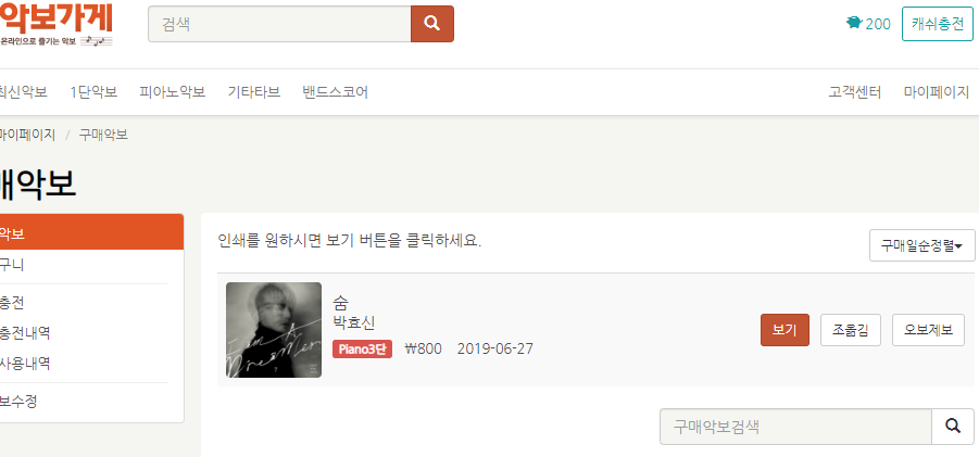 어제 박효신 숨 피아노 연습할려고 악보사이트에서 구매를 햇는데
