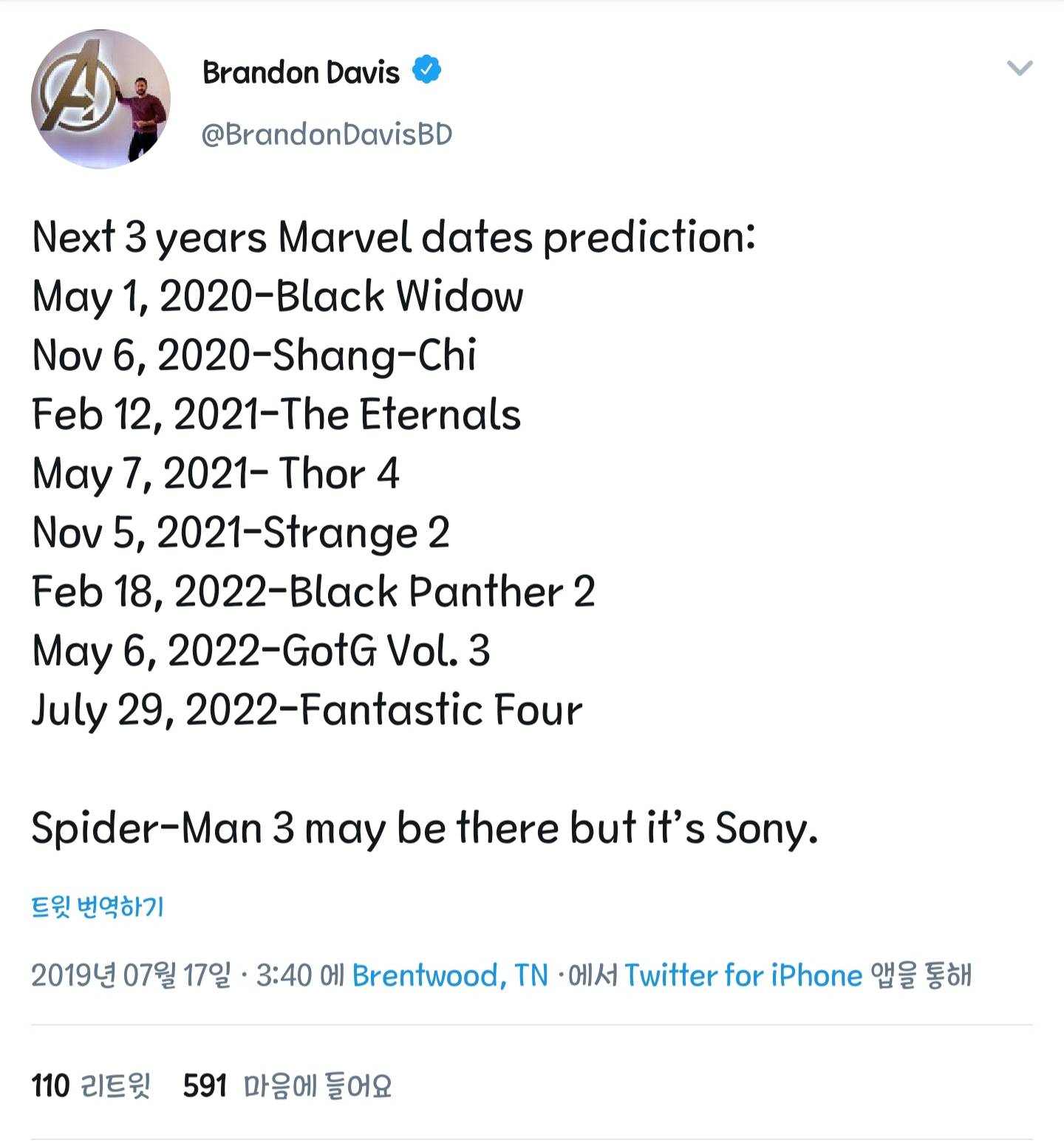 코믹북 기자 브랜든 데이비스는 오늘 자신의 트위터 계정을 통해 다음 3년간 개봉될 마블 페이즈 4의 예상 라인업을 공개하였다고 합니다.