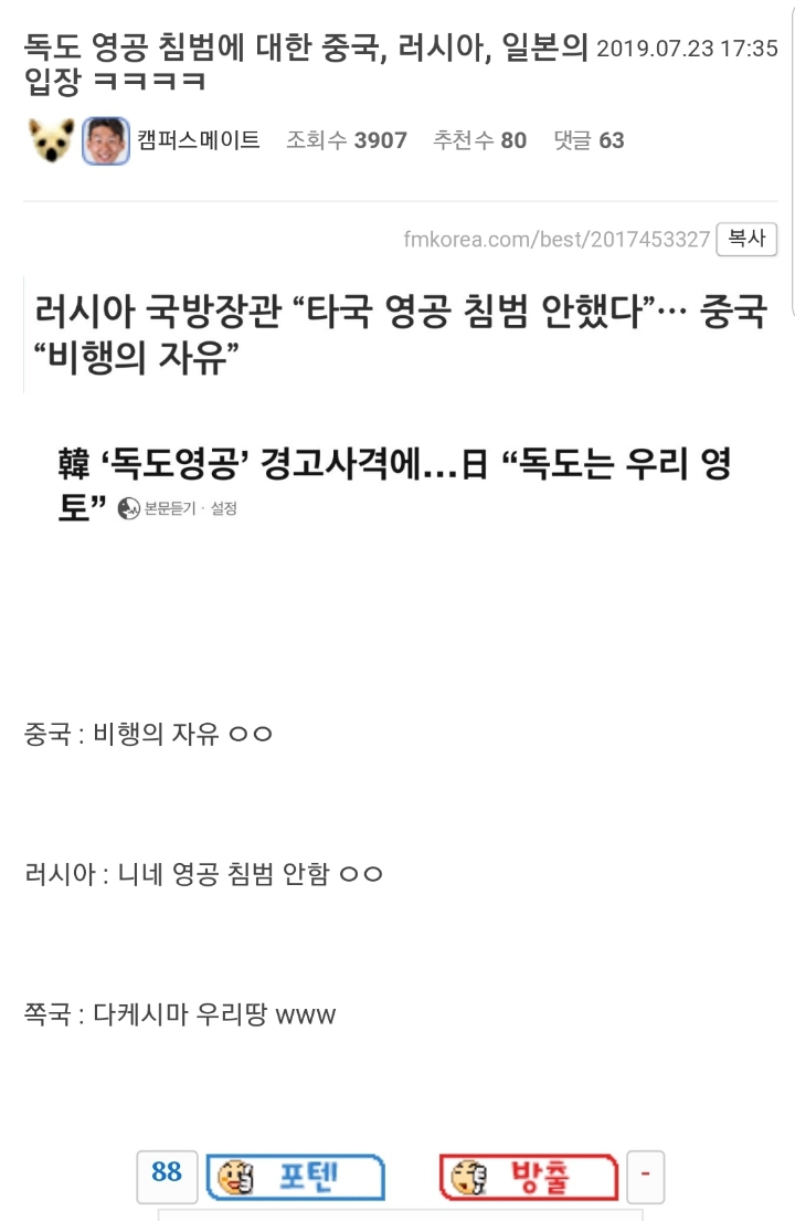 뻔한 소리겠지만 울나라는 화력은 동맹 한 두개 끼면 자국을 지킬 정도는 되는데 나라가 어느정도 살아서 지켜야할게 너무 많아