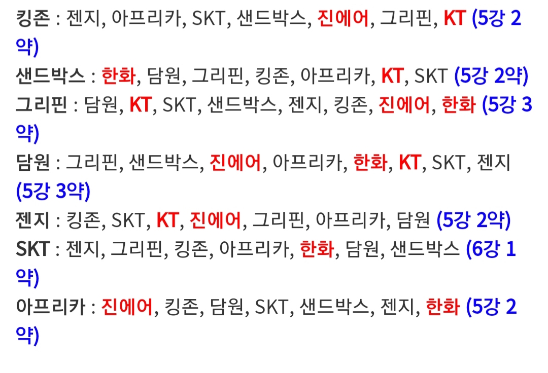 담원킹존 두팀은 확정이고 솔직히 샌박이랑 그리핀이 불안함 경기력이 슼이나 아프리카는 저 두팀노려야할듯
