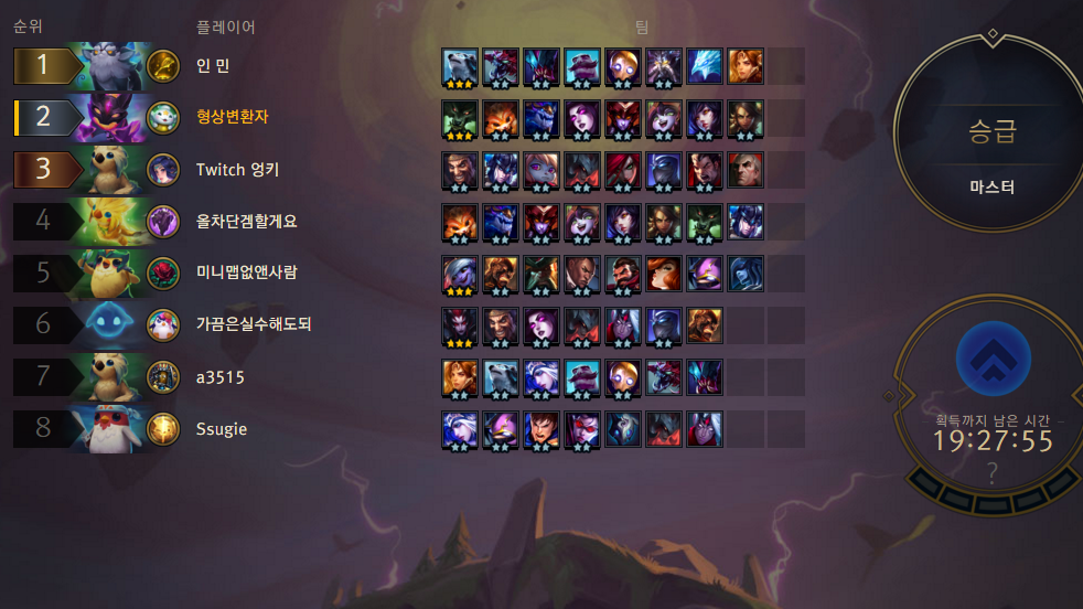 담턴에 9렙찍고 6메이지 까지할려고했는데 라이프 5정도만더있었어도 6메까지하는데 ..아쉽다 그냥50골로 쉬바나 3성을 돌려볼껄그랬나 암튼 마스터 낼 저녁에 그마로 자동승급된당