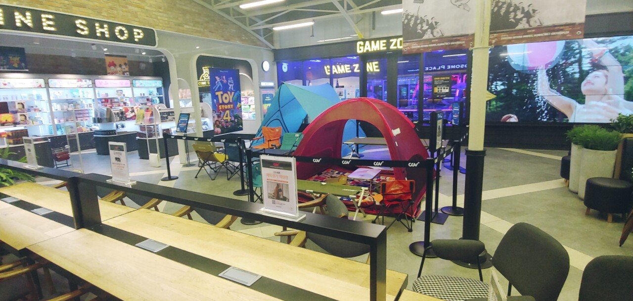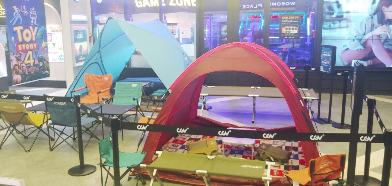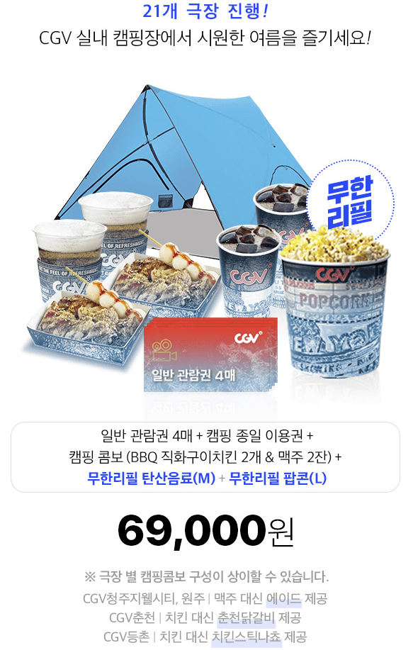 기네스 원래 선동기사 잘 퍼오잖아 ‘무더위 캠핑 패키지’는 CGV 로비 내 안락하게 설치된 2~3인용 텐트를 종일 이용할 수 있는 캠핑이용권과 일반 2D 영화관람권 4매와 치킨 메뉴 및 맥주 2인 세트, 팝콘과 콜라 무제한 콤보로 구성했다. ...잉?