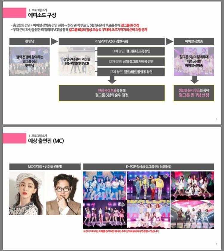K팝 정상급 걸그룹 6팀이 출연, 파격적인 정면승부로 대한민국 걸그룹 ‘퀸’을 가리는 컴백 컴피티션으로 한 관계자는 “걸그룹 동시 컴백 대결쇼”라고 소개.