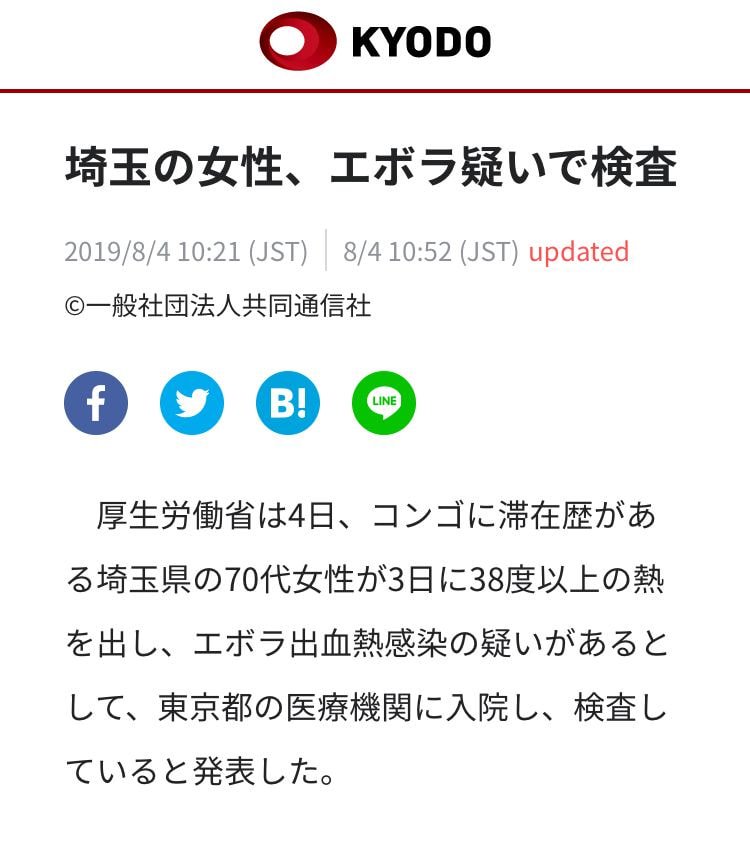 콩고에서 7월 31일자로 일본에 귀국한 70대 여성의 체온이 3일 밤 39도 이상까지 오르는 고열 증상.