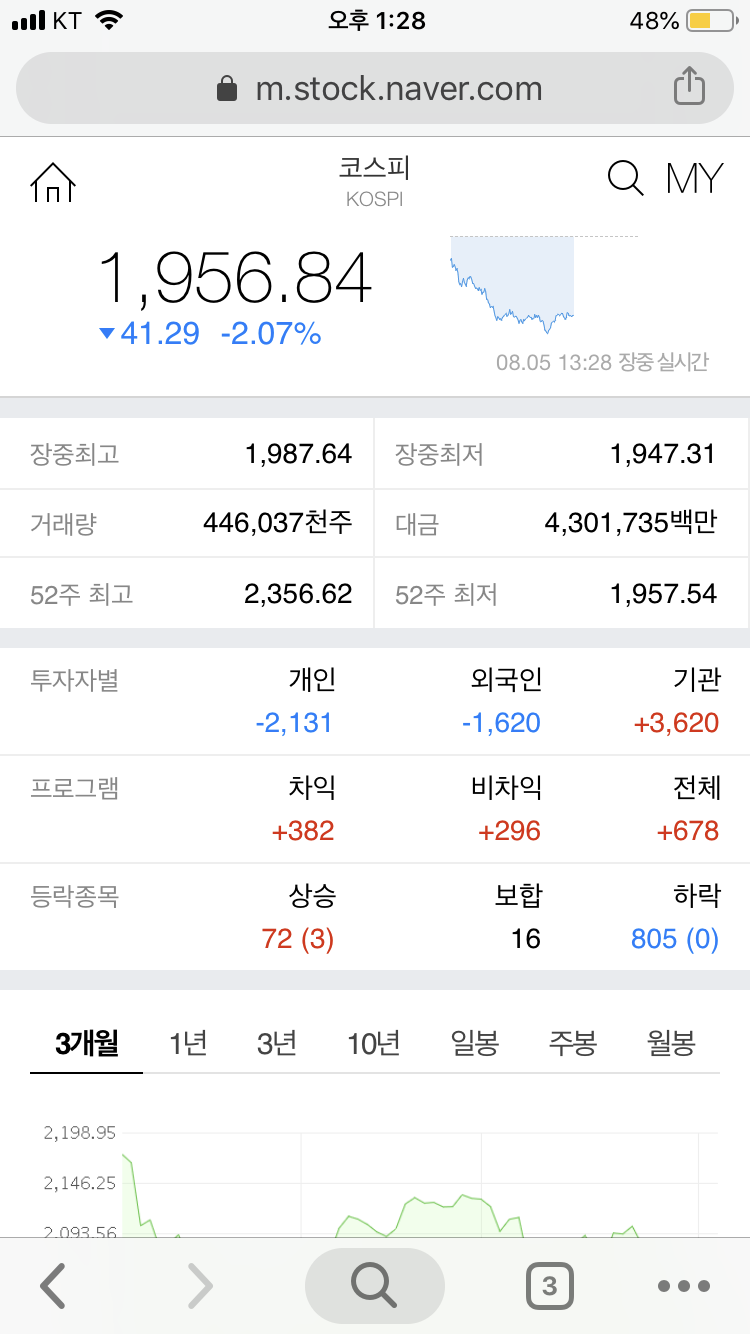 코스닥이ㅜ아니라 코스피. 아니 근데 두번째 짤은 오늘 수치 맞음? 저긴 코스피사 1800대인데