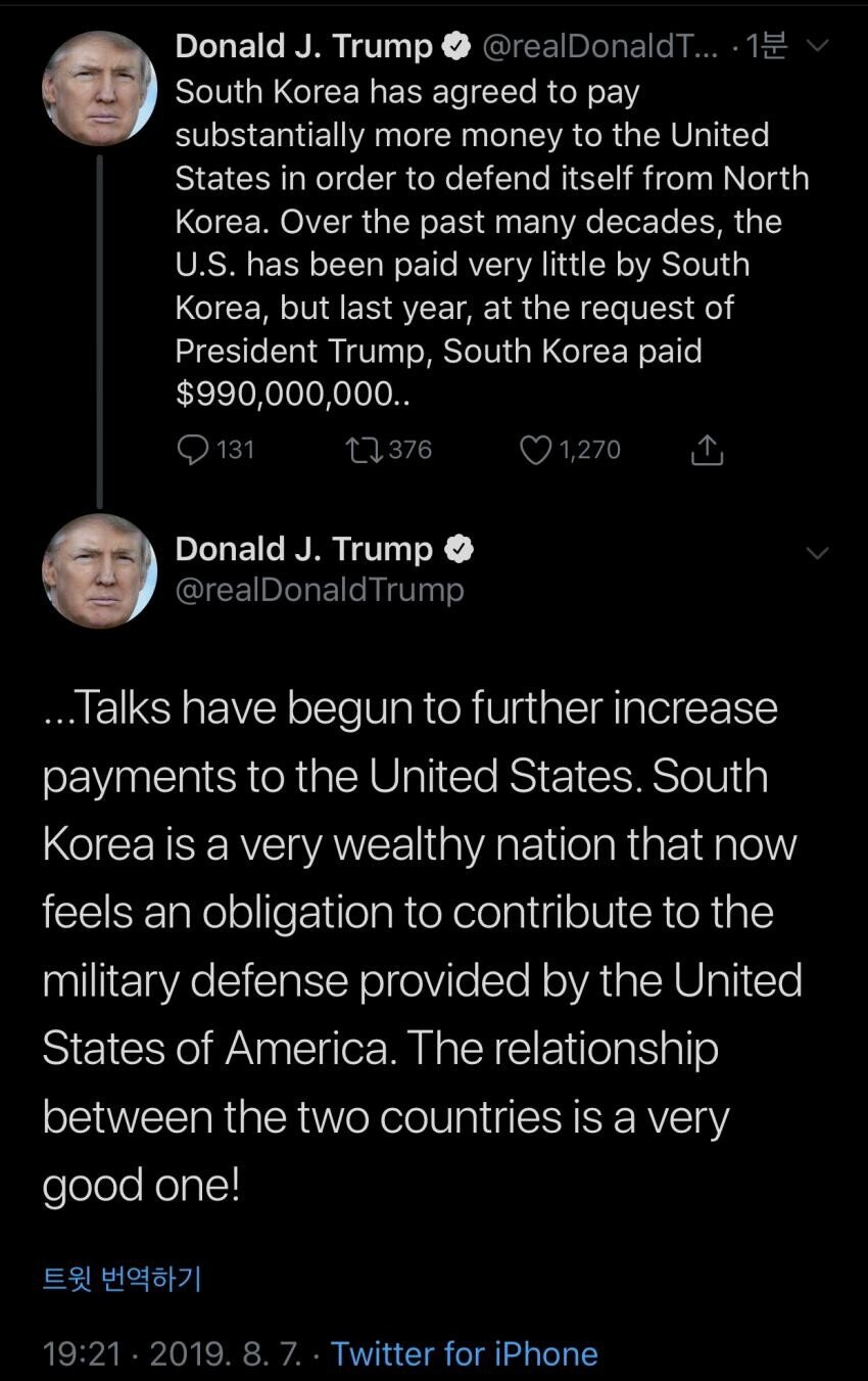 방위 분담금 추가 요구한거 내줘서 고맙다고 트윗으로 칭찬함