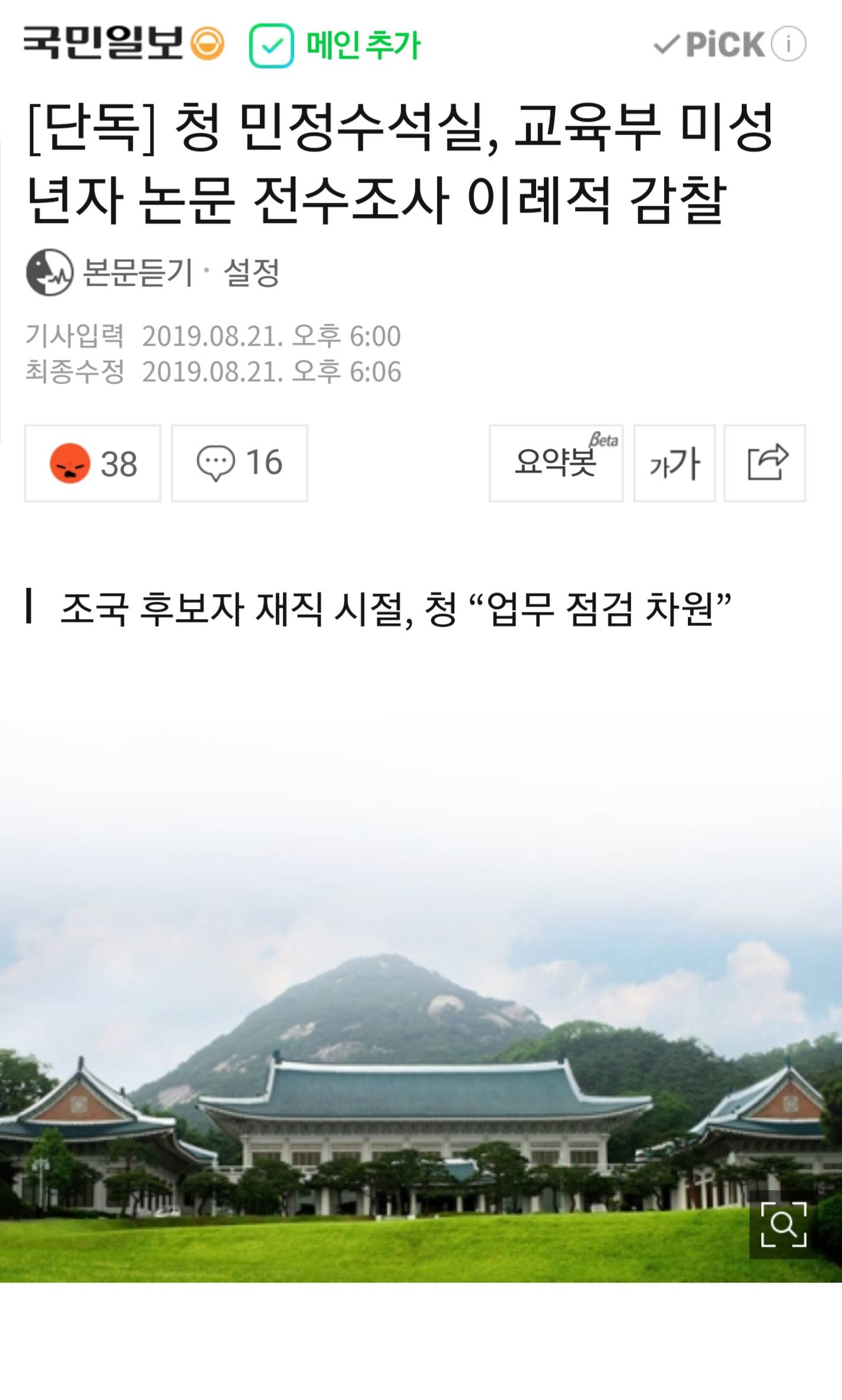 근데 조사하던 교육부 담당자들을 청와대 민정수석실에서 불러서 조사방식, 조사현황 등을 감찰함