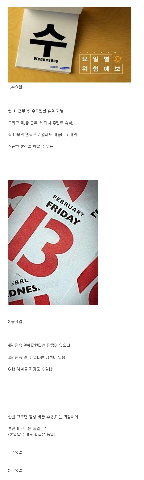 난 개인적으로 지금도 토요일 대신 수요일이나 목요일에 쉬어야한다는 생각이다
