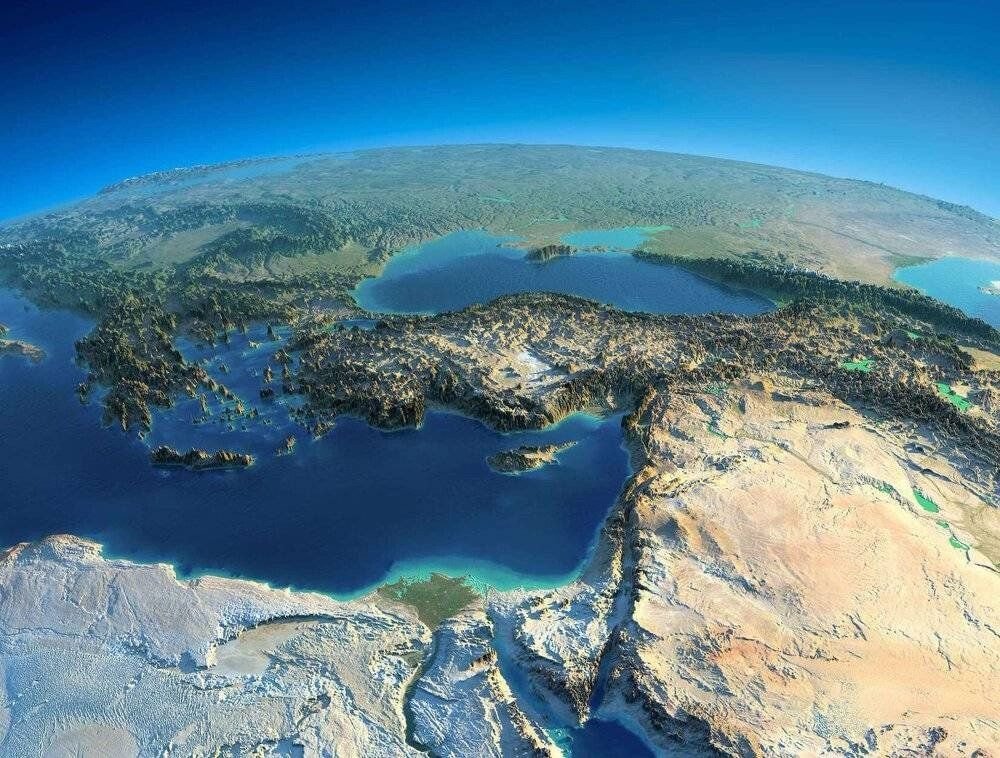 소아시아라고 불리기도 하는 유럽 역사에 중요한 장소, 아나톨리아 반도다. 옹기종기 섬들이 모여있는 바다가 에게해이고 그 기준으로 왼쪽이 현재의 그리스이고, 오른쪽의 아나톨리아 반도가 현재의 터키다. 사진에서 보이듯이 그리스와 아나톨리아는 유럽과 아시아를 이어주는 요충지였고 그렇기 때문에 비잔티움(동로마), 셀주크 튀르크, 오스만 제국 등 수만은 대제국들의 근거지가 되었다. 아나톨리아와 그리스가 이어지는 부분에 있는 도시가 바로 이스탄불(콘스탄티노플)이다. 오른쪽의 사막지대가 기독교의 발상지인 레반트 지역이다. 가운데 아래쪽에는 가장 오래된 문명인 이집트 문명을 키운 원동력. 비옥한 나일강 삼각주가 보인다.