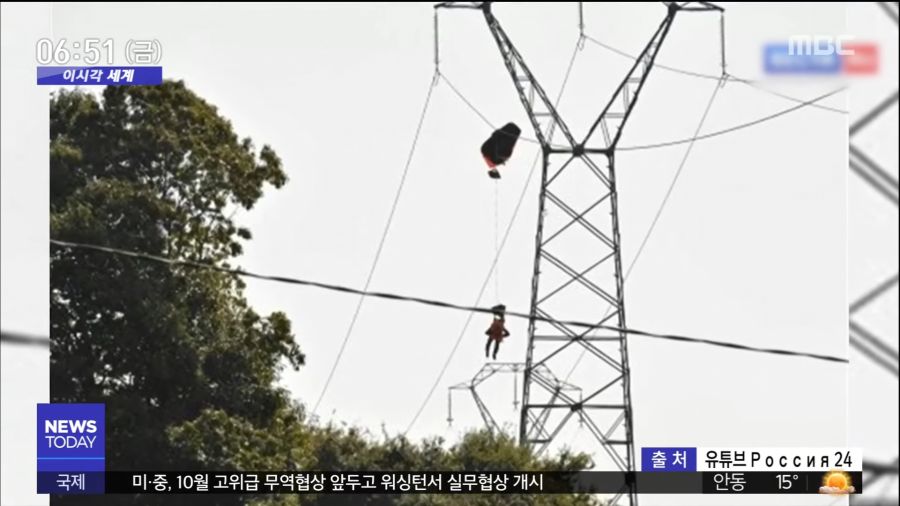 탈출한 조종사 25만볼트 고압선에 대롱대롱