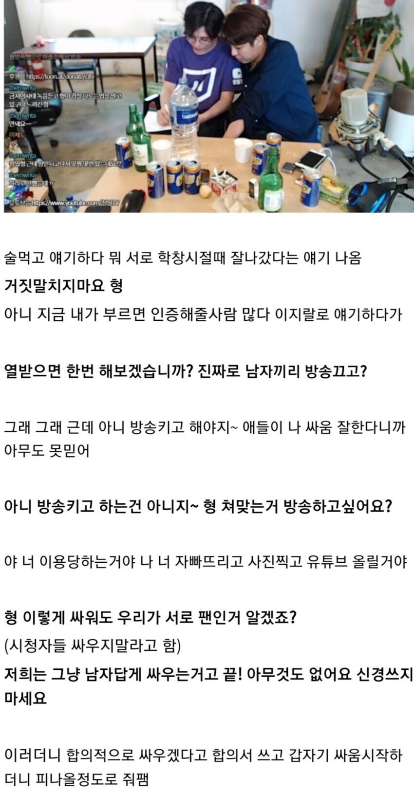 방송보고 왔는데 보라색이 형이고 쳐맞는게 동생임 계속 깐족거리면서 시비털면서 싸우자던거 동생 먼저 넘어뜨리면서 싸움건것도 동생인데 동생이 그냥 개쳐맞고 끝남 ㅋㅋ 근데 딱봐도 보라색티는 술덜취했고 남색은 개꼴아서 혀다꼬이고 눈풀리고 그랬는데 애초에 지면 븅신 이라함