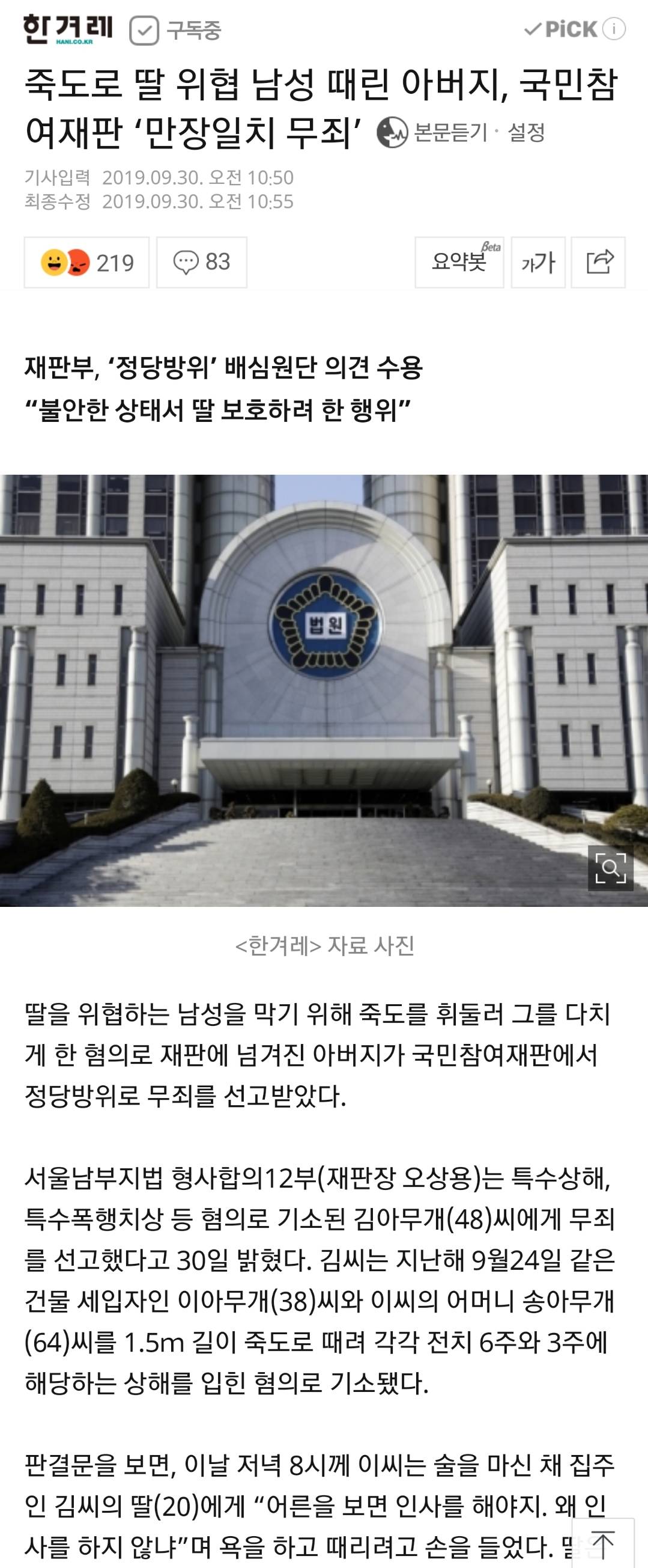 일단 구체적 상황은 모르겠지만 국민참여재판으로 간건 대단히 현명한 선택이었던거같다. 이거 피고만 원한다고 되는건가? 순수 법리로 가면 워낙에 정당방위 과잉대응의 범위가 국민정서에 비해 좁아서 말이지