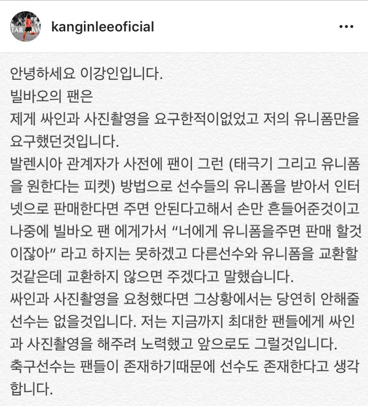이에 이강인은 해당 팬에게 다가가 친절히 사진을 찍었다. 이후 보도들에 의하면 이강인은 친필 사인 유니폼까지 선물한 것으로 알려졌다. 자신의 행동을 만회한 것.