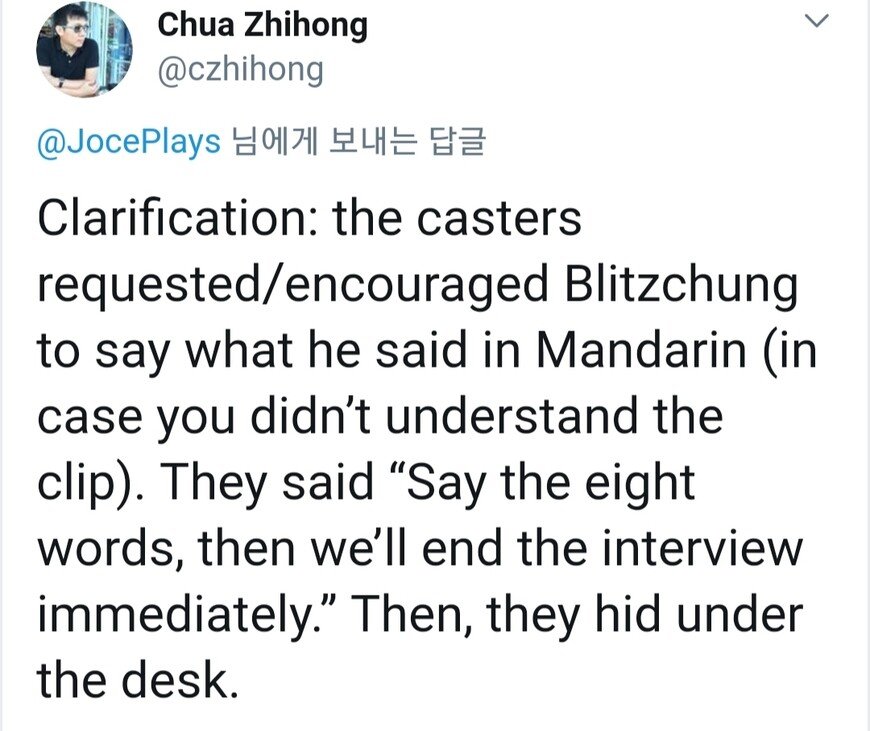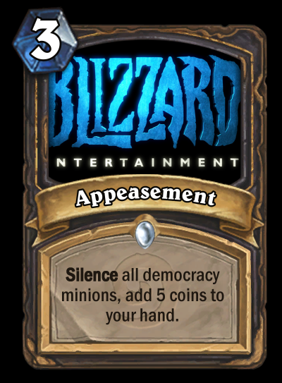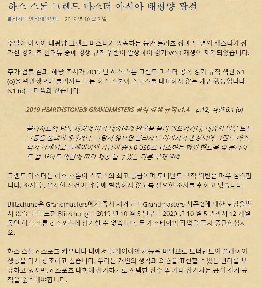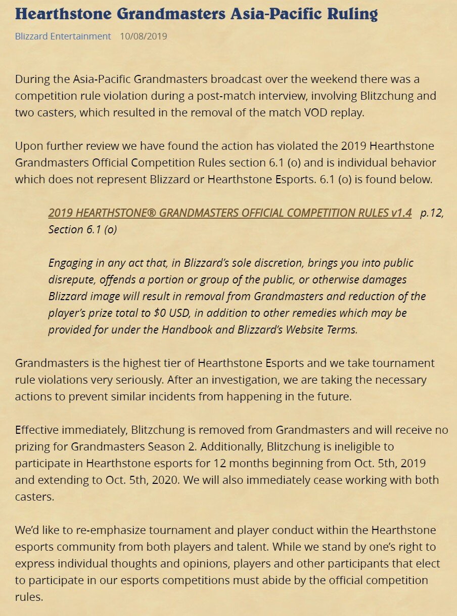 지난주에 blitzchung라는 닉네임을 쓰는 홍콩 출신의 하스스톤 프로 게이머 Wai Chung이 게임이 끝난 후 인터뷰 시간에 마스크를 쓰고 나와 "홍콩 민주화! 우리 세대의 혁명!(Liberate Hong Kong, revolution of our age!)" 외쳤다고 함. 게임 캐스터들은 자신과 상관 없음을 표명하기 위해 얼른 책상 밑으로 숨고 곧 이어 광고로 전환됨.