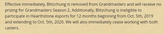 blitzchung의 그랜드 마스터와 상금을 몰수하고 1년간 자격 정지 판정. 게다가 뜬금 없이 캐스터 두명 역시 해고됨.