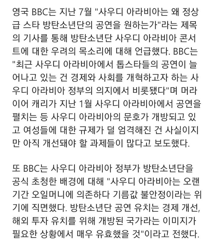 사우디 공연은 무함마드 빈 살만 왕세자의 공식 초청으로 이루어진 것.