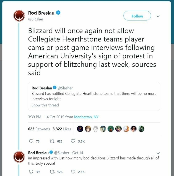 블리자드는 지금 시각으로 현재 미국에서 벌어지고 있는 하스스톤 대학 리그의 모든 플레이어 캠&인터뷰를 금지하기로 결정