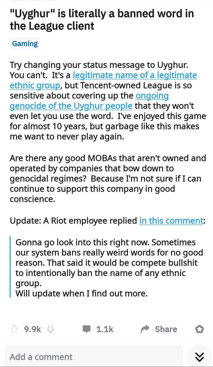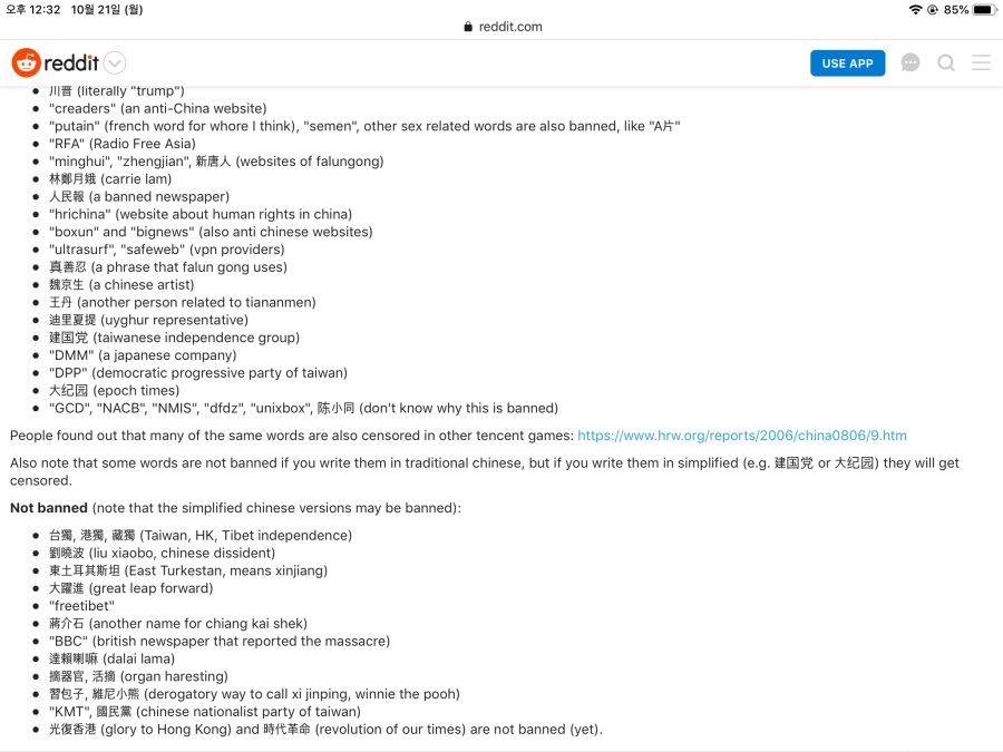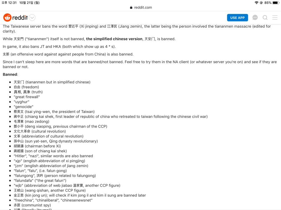 대만 서버유저가 대만서버의 천안문, 자유, 문화대혁명등이 포함된 금지어리스트도 공개했습니다.