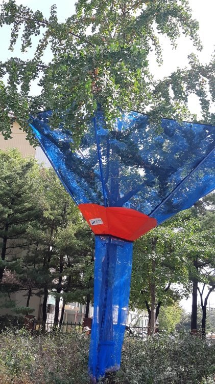 개당 70만원 정도의 비교적 많은 설치비가 든 데 비해 넓은 나뭇가지에서 떨어지는 은행 열매를 이 그물망으로 모두 수거하는 데 한계가 있기 때문이다.